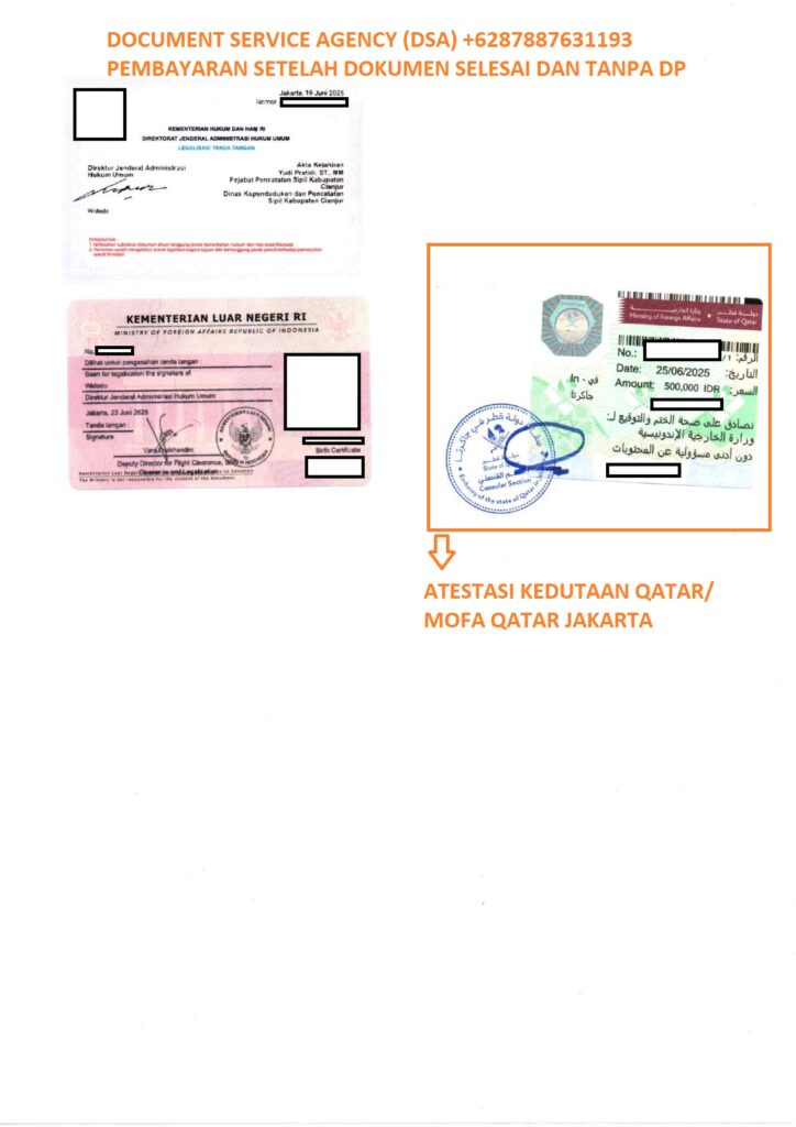 DSA (Document Service Agency) adalah spesialis jasa terjemah, legalisir, atestasi, apostile dokumen untuk keperluan di luar negeri dan pengurusan visa berpengalaman dan terpercaya. Bagi anda yang ingin melegalisir akta kelahiran di Kedutaan Qatar untuk keperluan pengurusan visa, izin tinggal, dan lain-lain. Percayakan legalisir dokumen anda kepada kami, dengan layanan ” Pembayaran Setelah Dokumen Selesai dan Tanpa DP ” anda akan merasa lebih nyaman dan aman menggunakan jasa kami. Dan dalam hitungan beberapa hari dokumen anda selesai dan siap untuk digunakan.