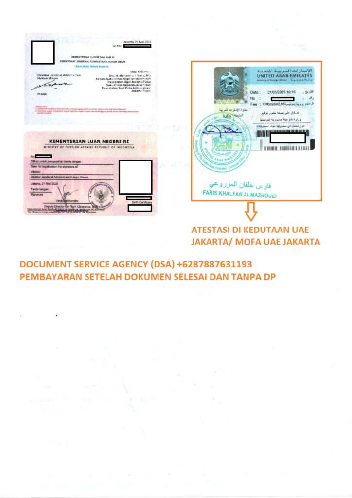 DSA (Document Service Agency) adalah spesialis jasa terjemah, legalisir, atestasi, apostile dokumen untuk keperluan di luar negeri dan pengurusan visa berpengalaman dan terpercaya. Bagi anda yang ingin melegalisir akta kelahiran di Kedutaan Uni Emirates Arab untuk keperluan pengurusan visa, izin tinggal, dan lain-lain. Percayakan legalisir dokumen anda kepada kami, dengan layanan ” Pembayaran Setelah Dokumen Selesai dan Tanpa DP ” anda akan merasa lebih nyaman dan aman menggunakan jasa kami. Dan dalam hitungan beberapa hari dokumen anda selesai dan siap untuk digunakan.