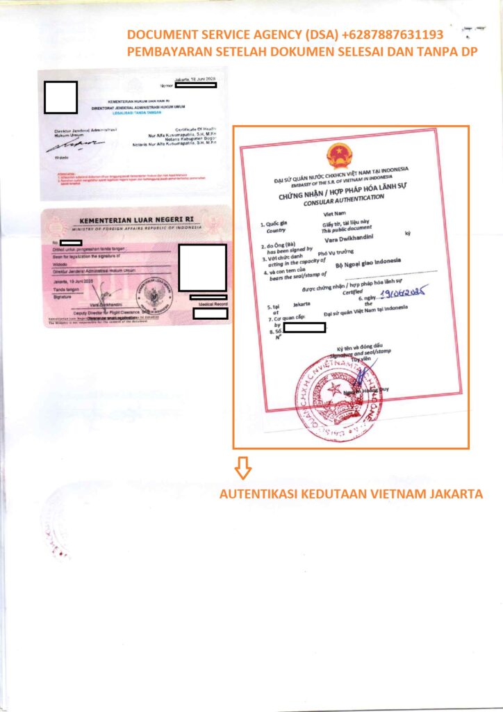 DSA (Document Service Agency) adalah spesialis jasa terjemah, legalisir, atestasi, apostile dokumen untuk keperluan di luar negeri dan pengurusan visa berpengalaman dan terpercaya. Bagi anda yang ingin melegalisir SKCK di Kedutaan Vietnam untuk keperluan bekerja, pengurusan visa, izin tinggal, dan lain-lain. Percayakan legalisir dokumen anda kepada kami, dengan layanan ” Pembayaran Setelah Dokumen Selesai dan Tanpa DP ” anda akan merasa lebih nyaman dan aman menggunakan jasa kami. Dan dalam hitungan beberapa hari dokumen anda selesai dan siap untuk digunakan.