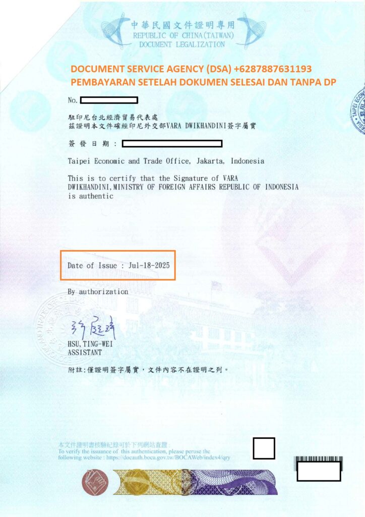 DSA (Document Service Agency) adalah spesialis jasa terjemah, legalisir, atestasi, apostile dokumen untuk keperluan di luar negeri dan pengurusan visa berpengalaman dan terpercaya. Bagi anda yang ingin melegalisir ijazah di Kedutaan Taiwan untuk study, keperluan bekerja, pengurusan visa, izin tinggal, dan lain-lain. Percayakan legalisir dokumen anda kepada kami, dengan layanan ” Pembayaran Setelah Dokumen Selesai dan Tanpa DP ” anda akan merasa lebih nyaman dan aman menggunakan jasa kami. Dan dalam hitungan beberapa hari dokumen anda selesai dan siap untuk digunakan.